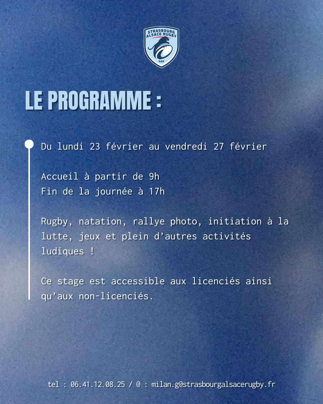 Le SAR est ravie de proposer des stages multisports pour les vacances de février ! Au programme ? Rugby, lutte, jeux de balles, piscine et bons moments ! Il est encore temps de s’inscrire : https://docs.google.com/forms/d/e/1FAIpQLSdnISeI37OFNOBuD5njrkhZjCFpLKHHyONqIU1J2y6-WTzZjw/viewform